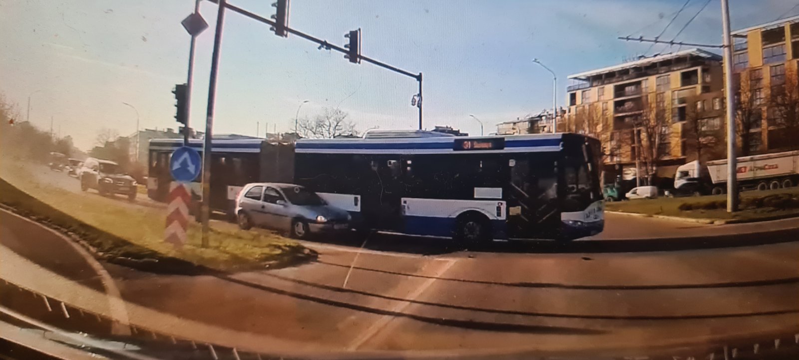 Автобус по линията 31 в посока квартал „Виница“ не спря на червен светофар и помете спрелия автомобил, видя репортер на „Будна Варна“.