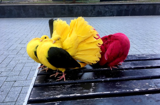 Гълъбите са декоративни, фенерлии. Те са изкуствено оцветени, със специална неопасна за пернатите боя.