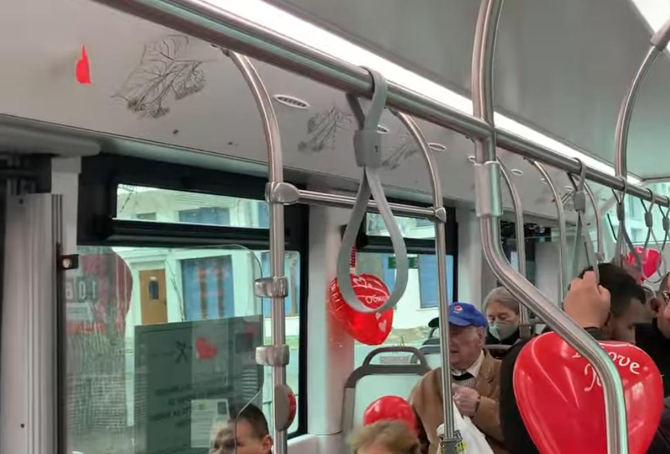 „Автобусът на любовта“ е пременен с балони във формата на сърце, както и тематични послания и валентинки.