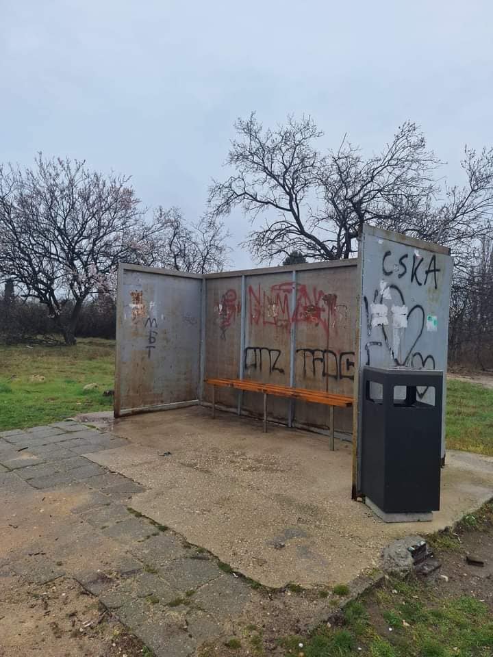 Я.С.: На тази спирка покривът го отнесе една буря и сега синият и покрив седи зад нея там до военното поделение, няма кой да го монтира. Снимай и онази пейка на спирката на Читалището. Сложиха нов асфалт, плочки, ама пейката стара повредена със стърчащи винтове и липсващи дъски я оставиха.