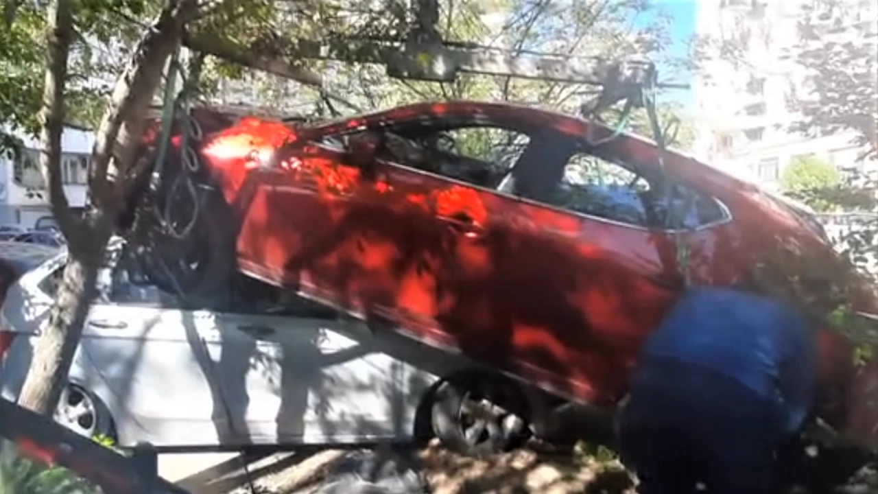За да бъде извадено превозното средство, което се е заклещило и в клоните на дърво, бе повикан общински паяк.