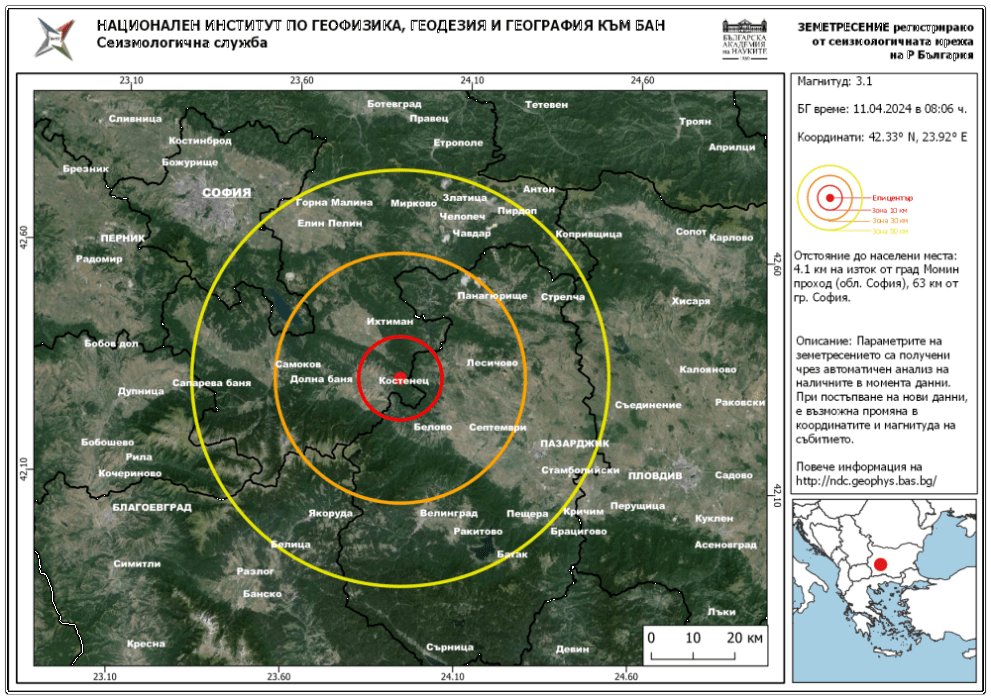 Земетресение е регистрирано в 08:06 часа в района на град Ихтиман в Софийска област. То е било с магнитуд от 3,1 по скалата на Рихтер. Това показват данни в сайта на Националния сеизмологичен център към Националния институт по геофизика, геодезия и география – БАН.