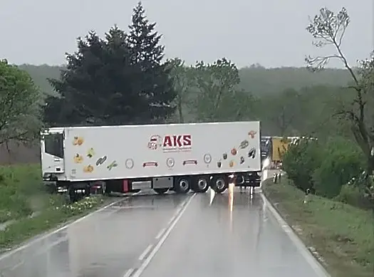 Камионът се е завъртял, а кабината му е спряла извън пътя, влекачът му – перпендикулярно на лентите за движение. Все още не са ясни причините за случилото се.