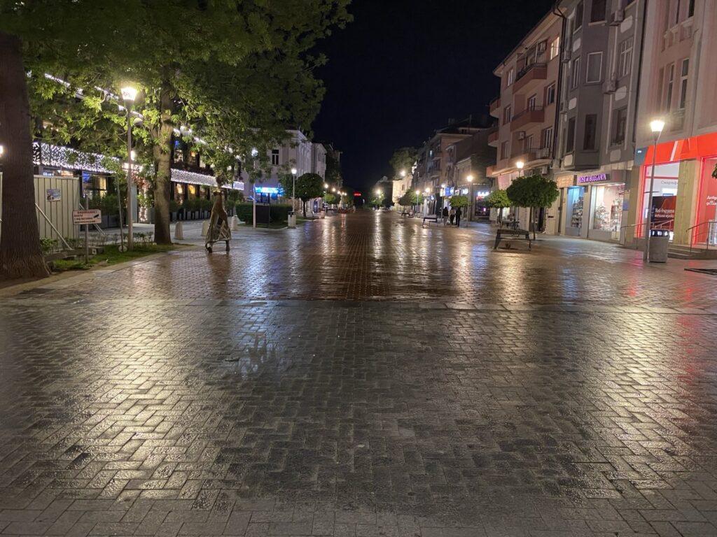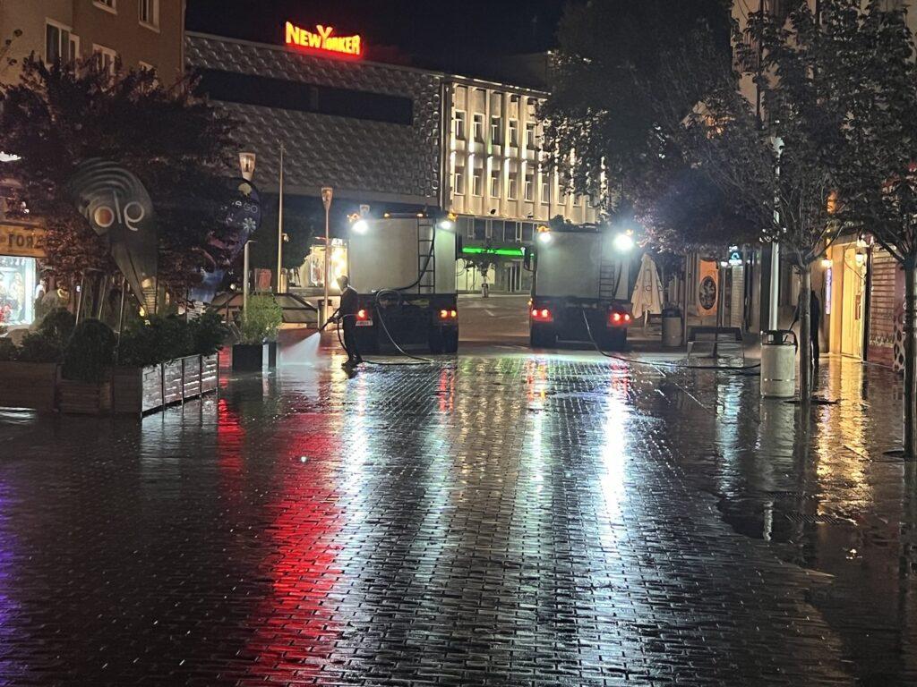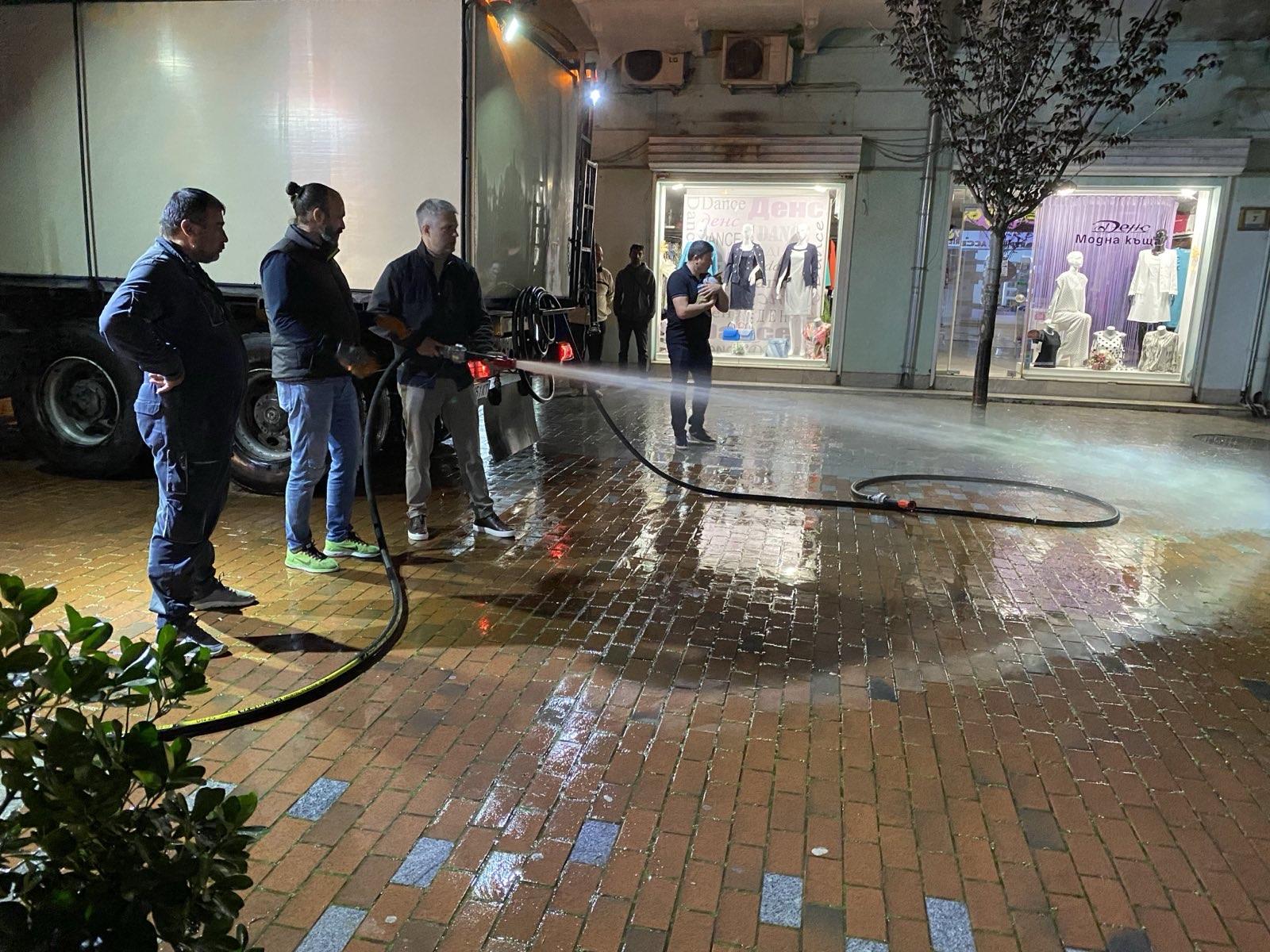 Снимки на които се вижда как се мие пешеходната зона на бул. „Княз Борис“, бяха качени на профила на кмета малко след 2 часа след полунощ.