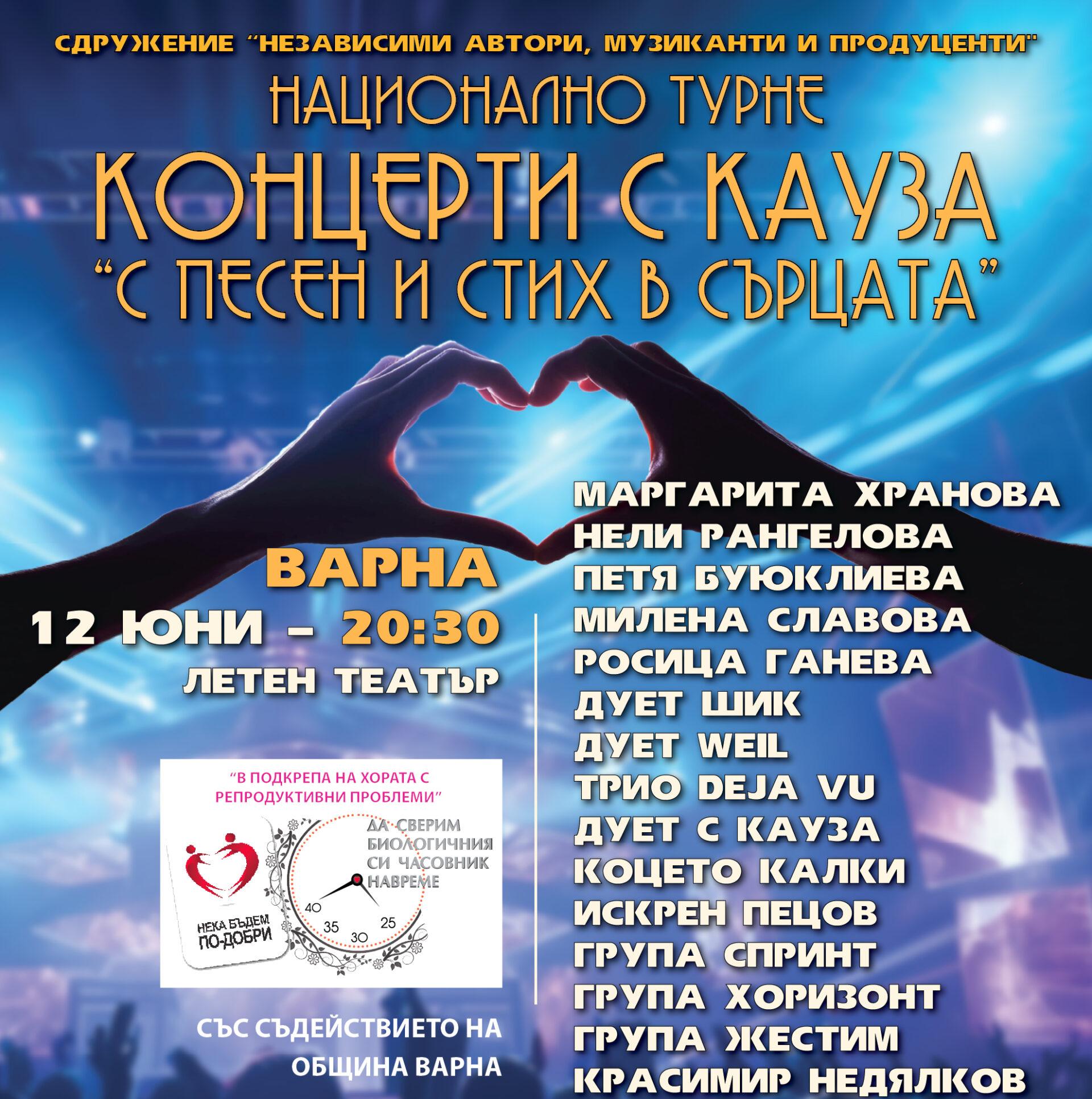 На 12 юни публиката в Летен театър гр. Варна посреща Националното турне „С ПЕСЕН И СТИХ В СЪРЦАТА“, което подкрепя обществено значимите за обществото ни каузи: Информационна кампанията „Да сверим биологичния си часовник навреме“ – за превенция и подкрепа на младите хора с репродуктивни проблеми „За повече българска музика в националния ефир“. Те са базирани върху важни социални проблеми, чието разрешаване ще се отрази положително и благоприятно върху българското общество.