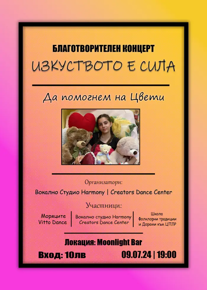 Ако искате да сте един от тях, заповядайте на 9 юли на благотворителния концерт “Изкуството е сила” в подкрепа на малката Цвети.