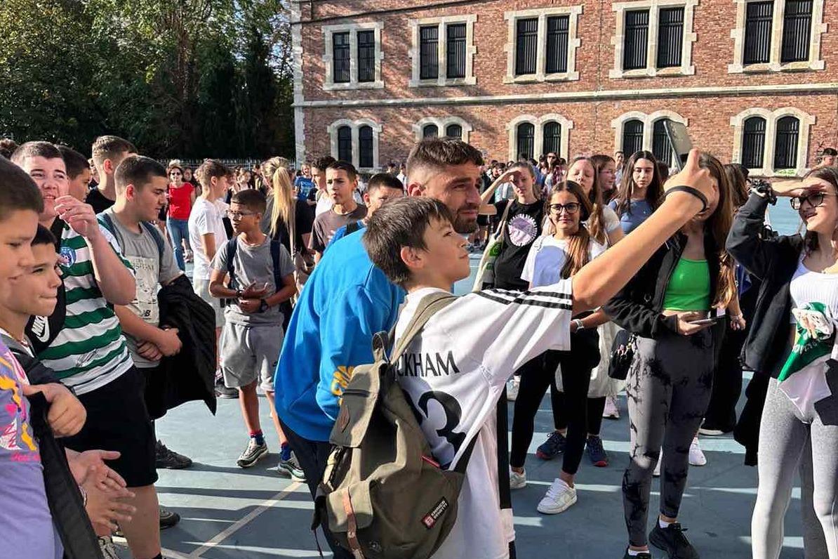 Даниел Димов даде началото на демонстративен мач между футболистите на училищния отбор и техни съученици, който донесе много настроение на децата.