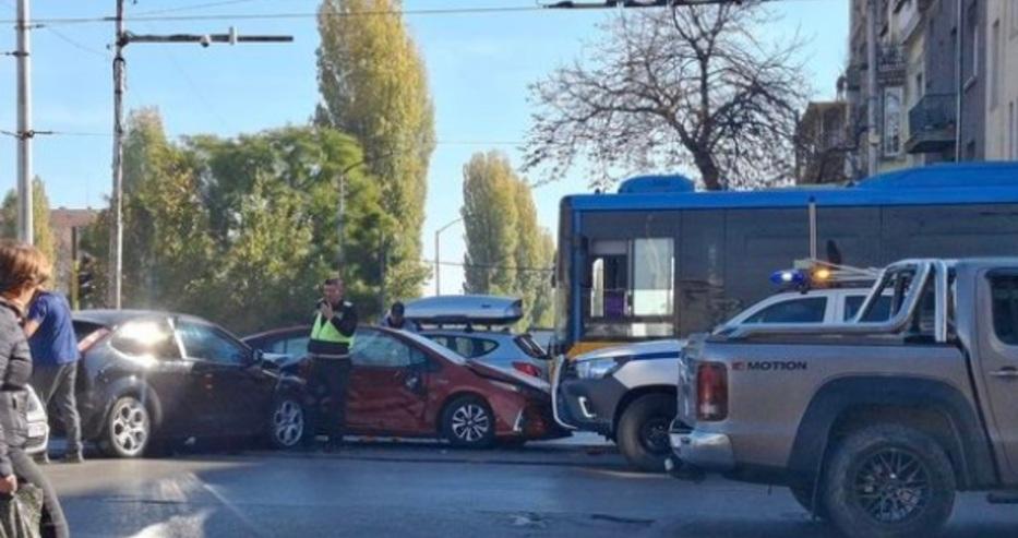 Катастрофа с автобус №60 и два леки автомобила затруднява движението на кръстовището на булевардите „Сливница“ и „Христо Ботев“ в София. От МВР съобщиха, че при инцидента, станал към 11.45 ч., няма пострадали, предаде Нова тв.