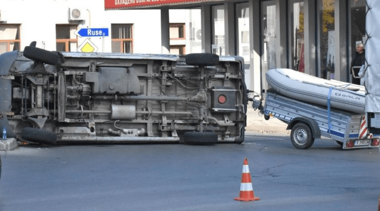 Кемпер с ремарке с натоварена надуваема лодка се преобърна на възлово кръстовище в центъра след сблъсък с фирмен камион.