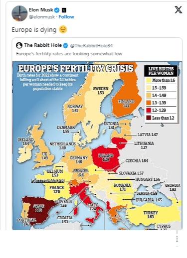 Европа умира. Това написа милиардерът Илон Мъск в платформата Х (бивш Twitter). Повод за думите му е ниският коефициент на раждаемост в Европа.