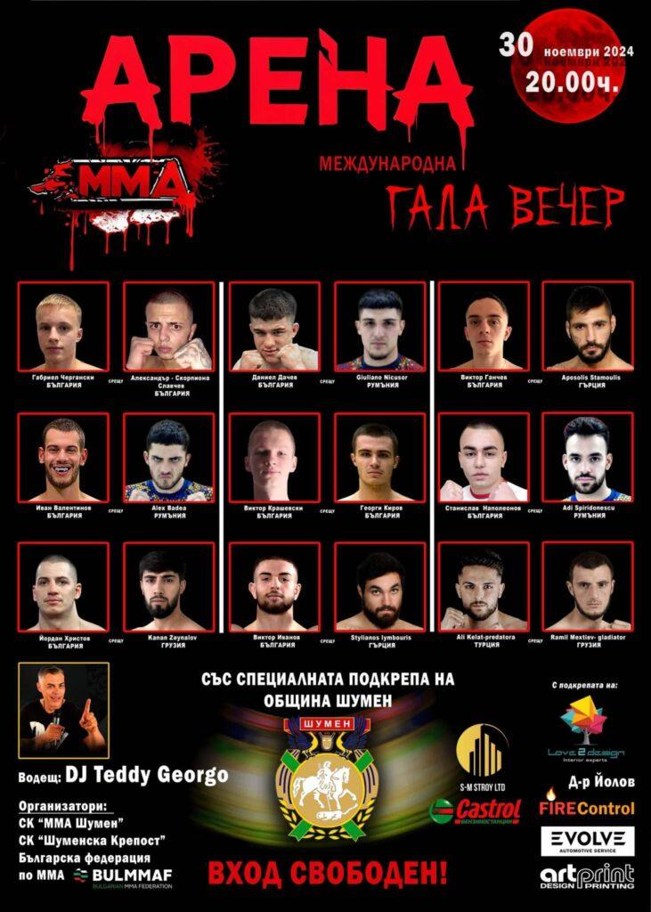 На 30.11./събота/ 2024г., от 20.00 часа, в спортна зала “Арена Шумен”, ще се проведе международна гала вечер по ММА и КИКБОКС. В нея ще вземат участие спортните клубове „ММА ШУМЕН“ и СК“ШУМЕНСКА КРЕПОСТ“, като домакини и състезатели от Гърция, Румъния, Грузия и Турция.