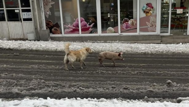 Малко прасе и куче скитат заедно от близо седмица в Благоевград. Малкото животинче не е прибрано от стопаните си и обикаля заснежените улици на града.