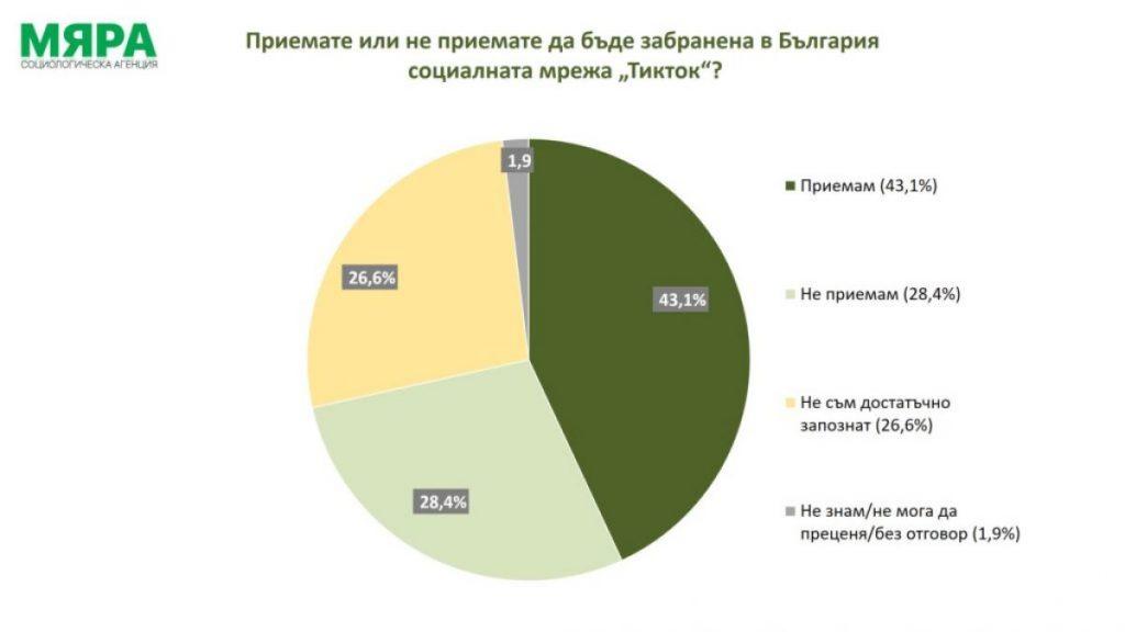 Лабораторно беше проверена идеята за евентуална забрана на мрежата „Тикток“ у нас: 43,1% реагират положително към забрана, 28,4% са против забрана, а 26,6% признават, че не са достатъчно запознати, за да формират ясна позиция. Към тях могат да се добавят още 1,9%, които не отговарят. Явно мненията засега са по-скоро скептични към „Тикток“ – вероятно сработва и известен поколенски рефлекс. В същото време запознатостта към темата едва ли е най-високата, дори и при новинарския поток, свързан с Румъния или САЩ. Това прави част от отговорите абстрактни и само последващо проучване би могло да установи детайлите.