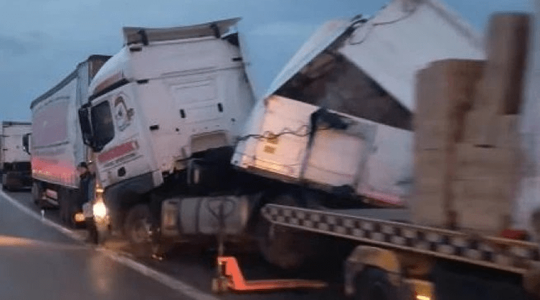 От публикувани в мрежата кадри се вижда, че един от камионите е излязъл извън пътното платно.