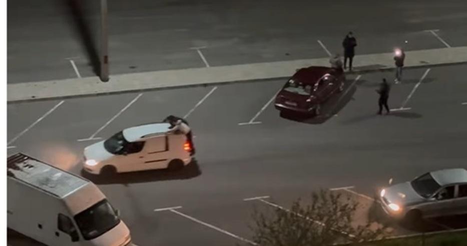 На видеото се вижда как двама младежи лежат върху покрива на движеща се кола, докато шофьорът прави резки маневри и форсира колата. Зад тях с висока скорост се движи втори автомобил.
