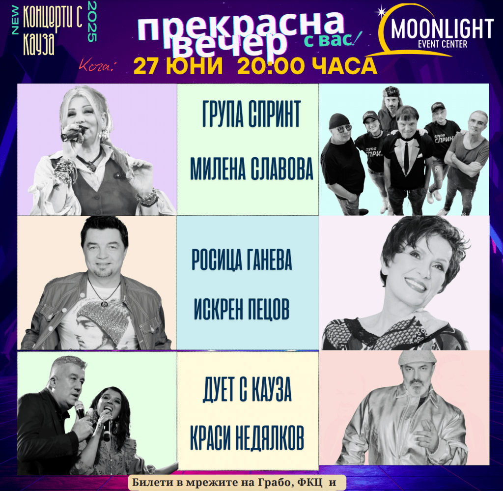 Благотворителността и изкуството вървят ръка за ръка в предстоящото събитие „Концерти с кауза: Прекрасна вечер с вас“, което ще се проведе на 27 юни 2025 година от 20:00 часа в Moonlight event center във Варна. Това специално музикално събитие ще събере на една сцена някои от най-обичаните български изпълнители, обединени от желанието да подкрепят значими обществени каузи чрез силата на музиката.