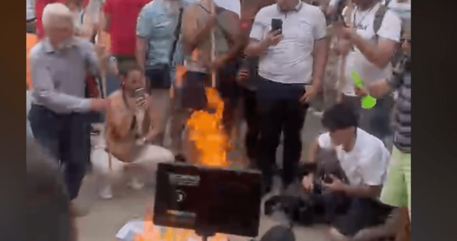 Протестиращите запалиха големи евробанкноти. Недоволните граждани скачат и пеят песни върху знамето на Еворпейския съюз, предаде Евроком.