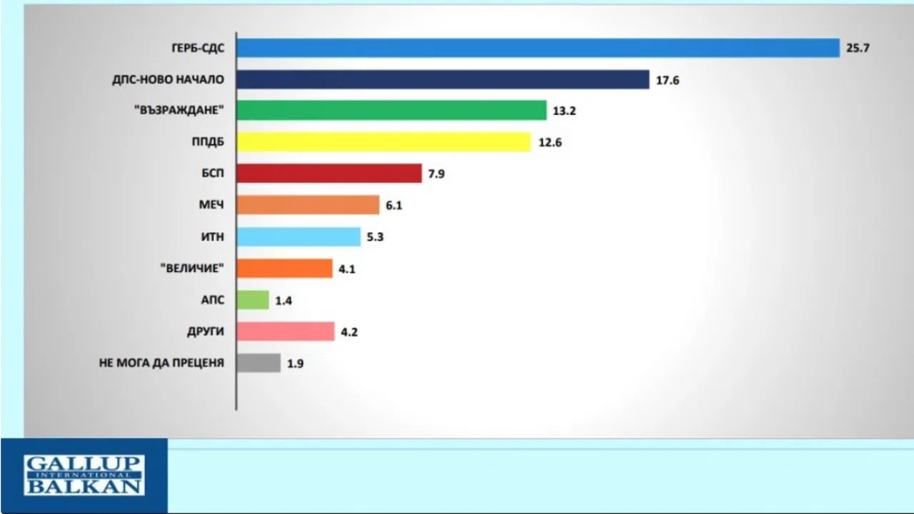 Останалите две формации в правителственото мнозинство също демонстрират стабилност – БСП получава 7,9%, а „Има такъв народ“ – (ИТН) – 5,3%. Тази устойчивост може да се обясни с участието им в управлението и умерената им политическа линия.