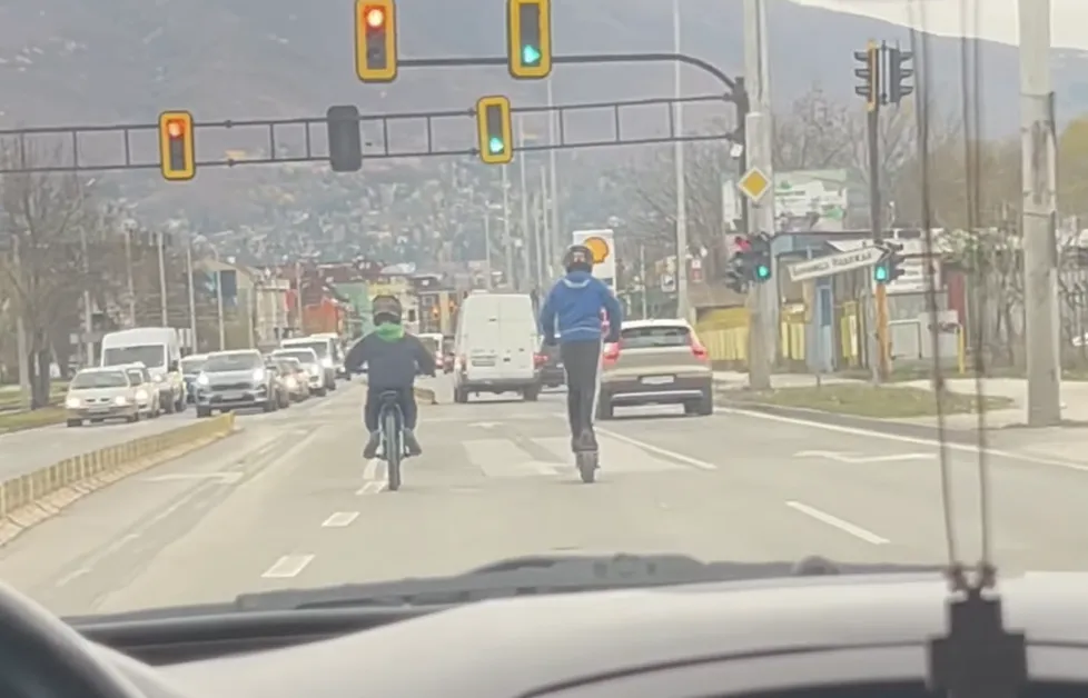 Деца бяха заснети на видео как карат по столичен булевард електрически тротинетка и велосипед. Опасната ситуацията се разиграва в петък – ден, в който децата трябва да бъдат на училище.