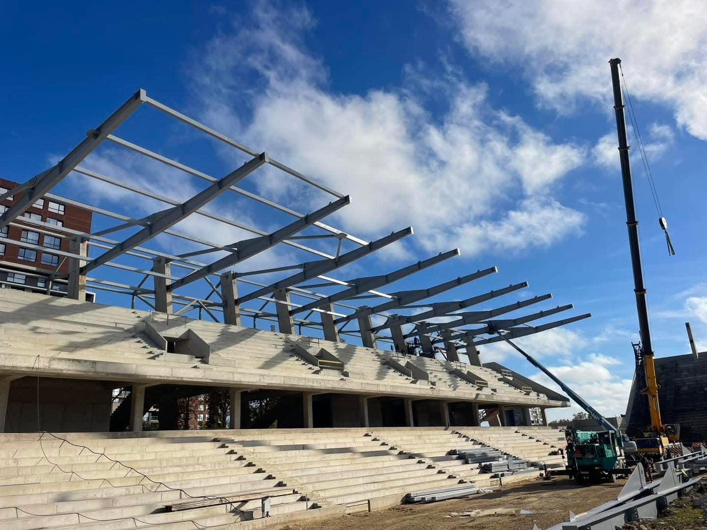 Фирма „Лалев“ ООД сподели впечатляващи снимки от строителния процес на козирката на стадион „Варна“. От кадрите ясно се вижда, че покривната конструкция напредва отлично и всички места вече са покрити. Работата е извършена с високо качество и внимание към детайла – истинско доказателство за професионализма на екипа.