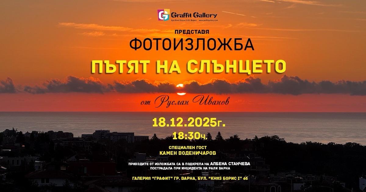 В навечерието на светлите коледни празници галерия “Графит” в гр. Варна ще ни стопли с най-красивата светлина – тази на изгряващото Слънце. В 45 художествени фотографии ще бъдат показани магически изгреви над морето край Варна. Уникалното е, че всички те са заснети само от една-единствена точка. Подбрани са от стотици фотоси, снимани в продължение на години.