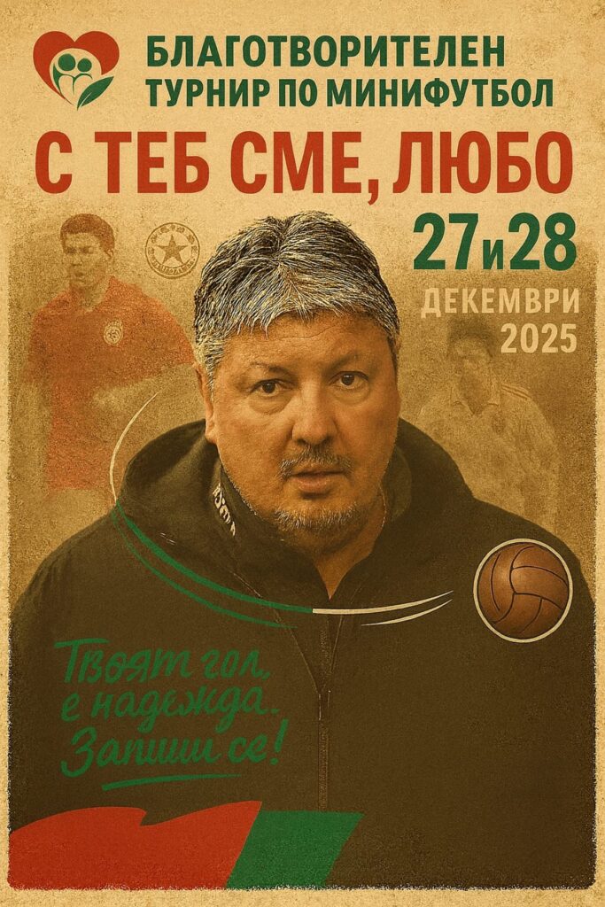 В навечерието на Коледните празници спортът и доброто се срещат в едно специално събитие – благотворителен турнир по минифутбол „С теб сме, Любо“, посветен на подкрепата за легендата на българския футбол Любослав Пенев.