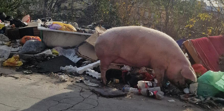 Жителка на квартал „Максуда“ във Варна сподели крайното си възмущение от ситуацията с безстопанствено прасе, което свободно преминава по пътното платно между автомобилите и се храни в преливащите контейнери с боклук.