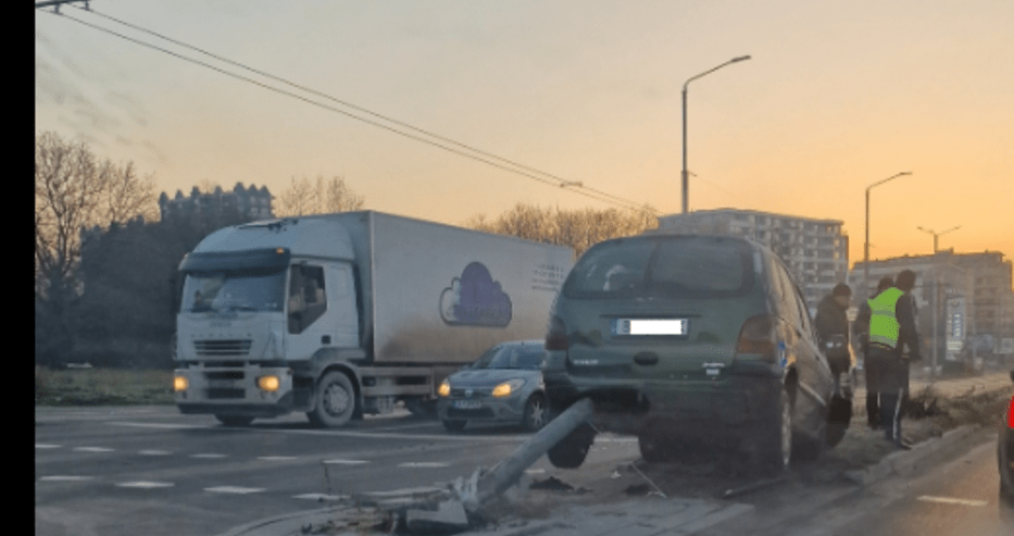 Автомобил „Рено“ е съборил светофара и го е свалил на земята.