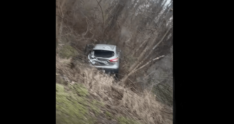От видеото се вижда, че автомобилът е навлязъл сред дърветата край пътя. Возилото е леко повдигнато от едната страна заради нападалите клони и храстите.
