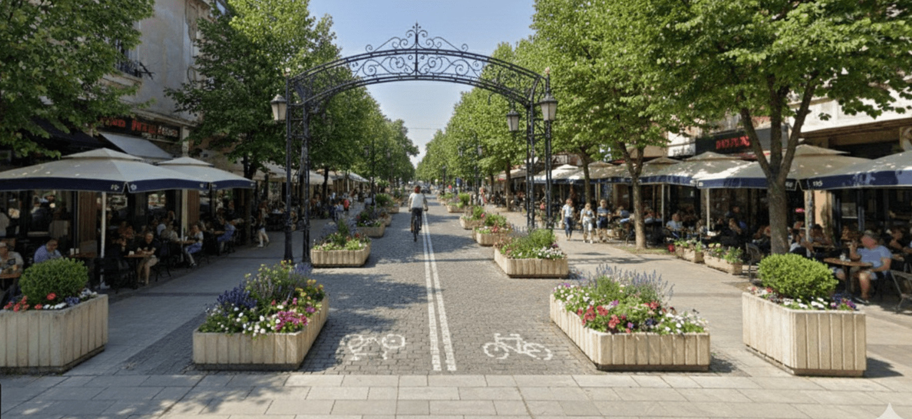 Изображението показва преобразен участък от бул. „Княз Борис I“ – между кръстовището при ВИНС и Севастопол. В концепцията автомобилният трафик е изцяло премахнат, а пространството е оформено като широка пешеходна алея с богато озеленяване, модерно улично осветление, велоалеи и зони за отдих с пейки. Предвидени са още места за културни събития на открито и повече пространство за заведения с открити тераси.