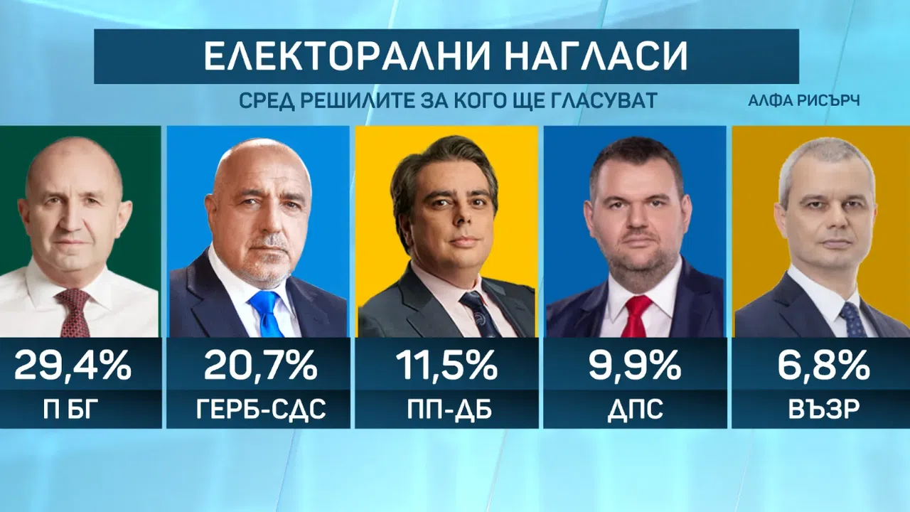 Според „Алфа Рисърч“ „Прогресивна България“ на Румен Радев би получила 29,4%. На второ място се нарежда коалицията ГЕРБ-СДС с 20,7%.