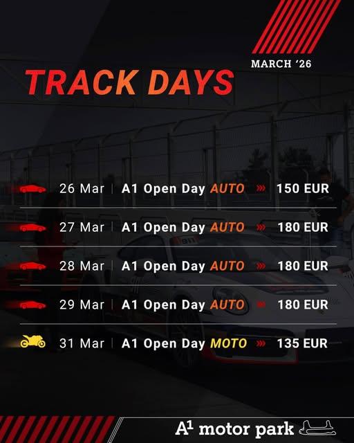 Новооткритата писта А1 мотор парк край Самоков обяви цените за свободно каране в планираните трак дни. От 26 до 29 март пистата е отворена за автомобили, които искат да запишат обиколки, а на 31 март е трак ден за мотоциклети. Цената за цял ден на пистата за автомобили е 150 евро на 26 март, а от петък до неделя е 180 евро. Вторникът за мотоциклети струва 135 евро.