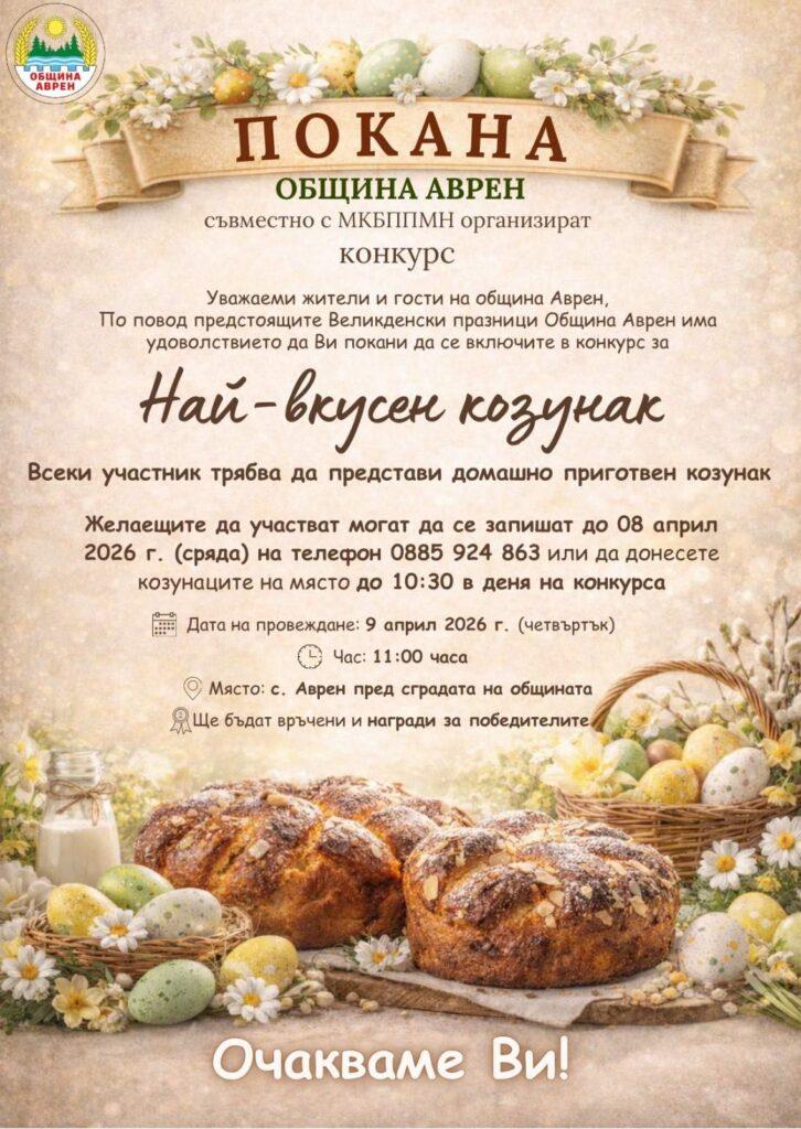 Община Аврен, съвместно с МКБППМН, обяви конкурс за „Най-вкусен козунак“ по повод предстоящите Великденски празници. Инициативата е насочена към всички жители и гости на общината, които желаят да покажат своите кулинарни умения.