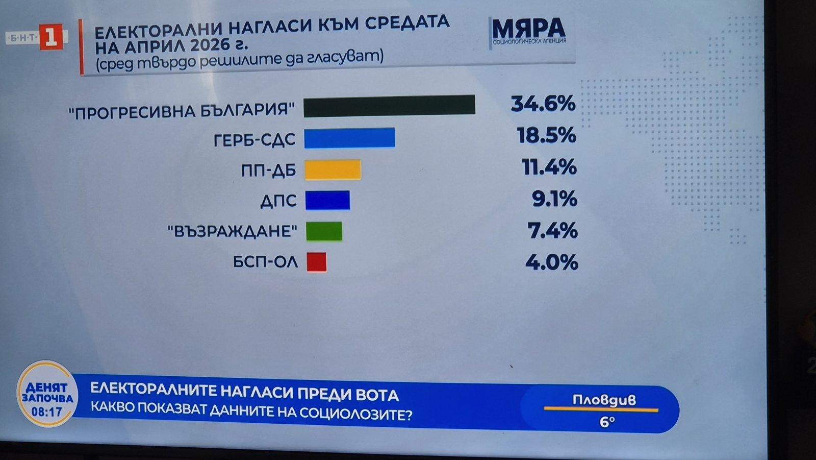Данните са на агенция „Мяра“ за Българското национално радио. Изследването е представително за пълнолетното население в България и е реализирано между 4 и 13 април 2026 г., като интервютата са проведени „лице в лице“, с таблети, сред 1002 пълнолетни български граждани. Максималната стохастична грешка е ±3,1 при 50% дялове. 1% от цялата извадка (а не от гласуващите) се равнява на близо 54 000 души, пише btvnovinite.bg.